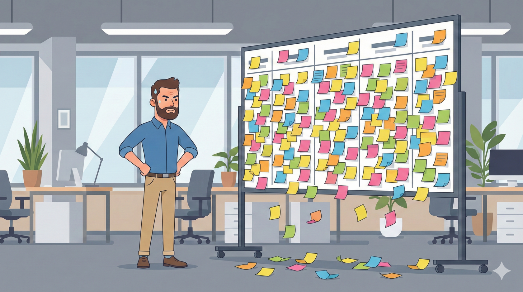 Почему стикеры (или карточки в Trello/Битрикс24) работают лучше списков? Потому что список — это текст. А Канбан-доска — это геометрия. Если в колонке «Согласование договора» скопилось 20 карточек, вы сразу видите «горб» или «пробку». Вам не нужно читать названия задач. Вы видите узкое горлышко процесса визуально.